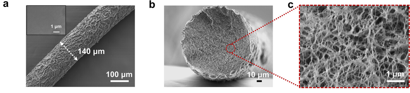 图1. ANFs气凝胶纤维 a)表面b, c)横截面SEM图像