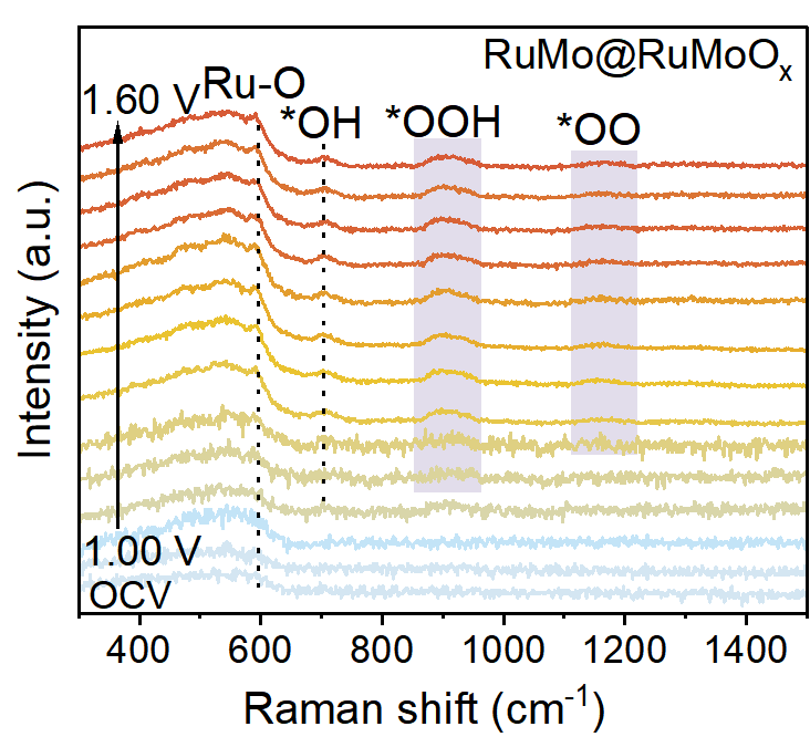 中心光谱分析室的拉曼光谱仪(labRAM Odyssey)主要承担了RuMo@RuMoOₓ电催化剂的结构性能表征。如图2所示,Ru@RuOx拉曼光谱出现了位于~521、639和700 cm⁻¹的特征信号,分别对应于Ru-O的Eg、A1g和B2g振动模式。在Ru@RuOx中,Ru–O峰的强度持续下降,主因是其在OER过程中不断溶解。值得注意的是,非对称B2g模式拉曼峰强度的增加表明OH在Ru位点上的吸附。对于RuMo@RuMoOx,一旦OOH峰出现,Ru-O和OH峰的强度便随之降低,说明OOH并非在Ru位点生成(图3)。这也为*OH的迁移提供了有力证据。