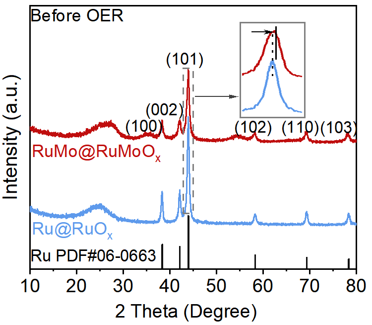 上述研究中,分析测试中心微区结构分析室的X射线衍射系统(Empyrean)主要承担了RuMo@RuMoOₓ电催化剂的物相性能表征。如图1所示, RuMo@RuMoOx样品的XRD图谱均显示出六方相Ru(PDF# 06-0663)的特征峰,其中(101)主峰位于44°。此外,掺杂Mo后,RuMo@RuMoOx样品的XRD峰强度降低,衍射峰变宽并移向更高角度,表明Mo已成功进入六方Ru晶格。